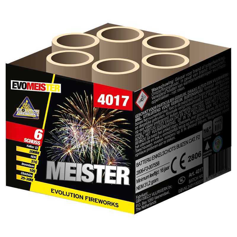 Meister, 6 schuss 18mm cake. Op dit kleine formaat een meester in zijn klasse. Geniet van een siercake voor een meesterlijk klein prijsje.